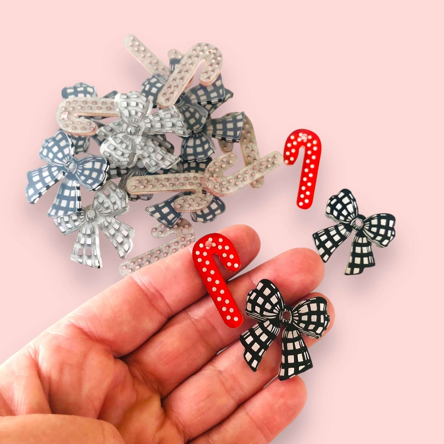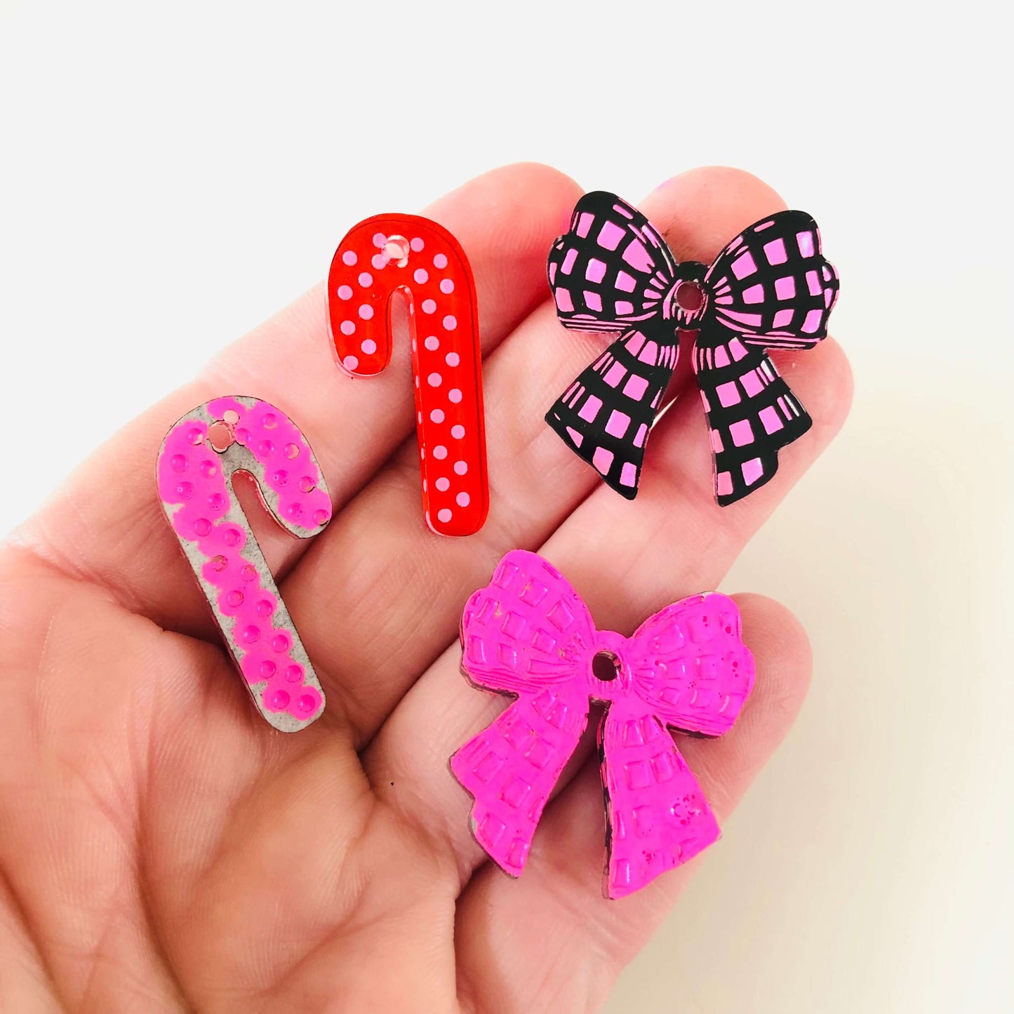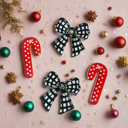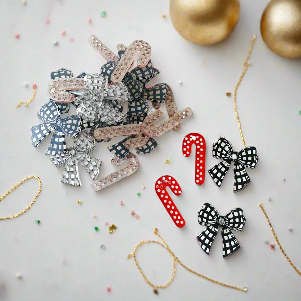 Choose between two adorable styles: the playful Spotty Cane or the charming Gingham Bow. Each set includes five delightful pairs, showcased in luxurious Deluxe Black and vibrant Deluxe Red. Image 3 shows a fun paint fill effect using neon pink acrylic paint pens.
