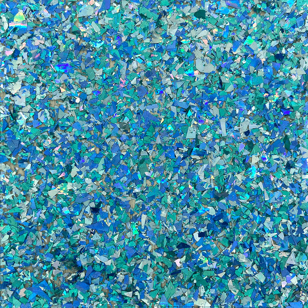 A thick layer of super shimmery iridescent silver, aqua and blue glitter shards layered onto clear acrylic.