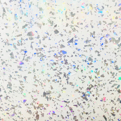 Lustrous shavings of holographic foil pieces scattered throughout a clear acrylic base - This is a transparent material foil density varies from sheet to sheet. The reflective nature of the Holographic foil gives of Silver tones and all through the Rainbow Spectrum depending on the light source angle hitting the acrylic